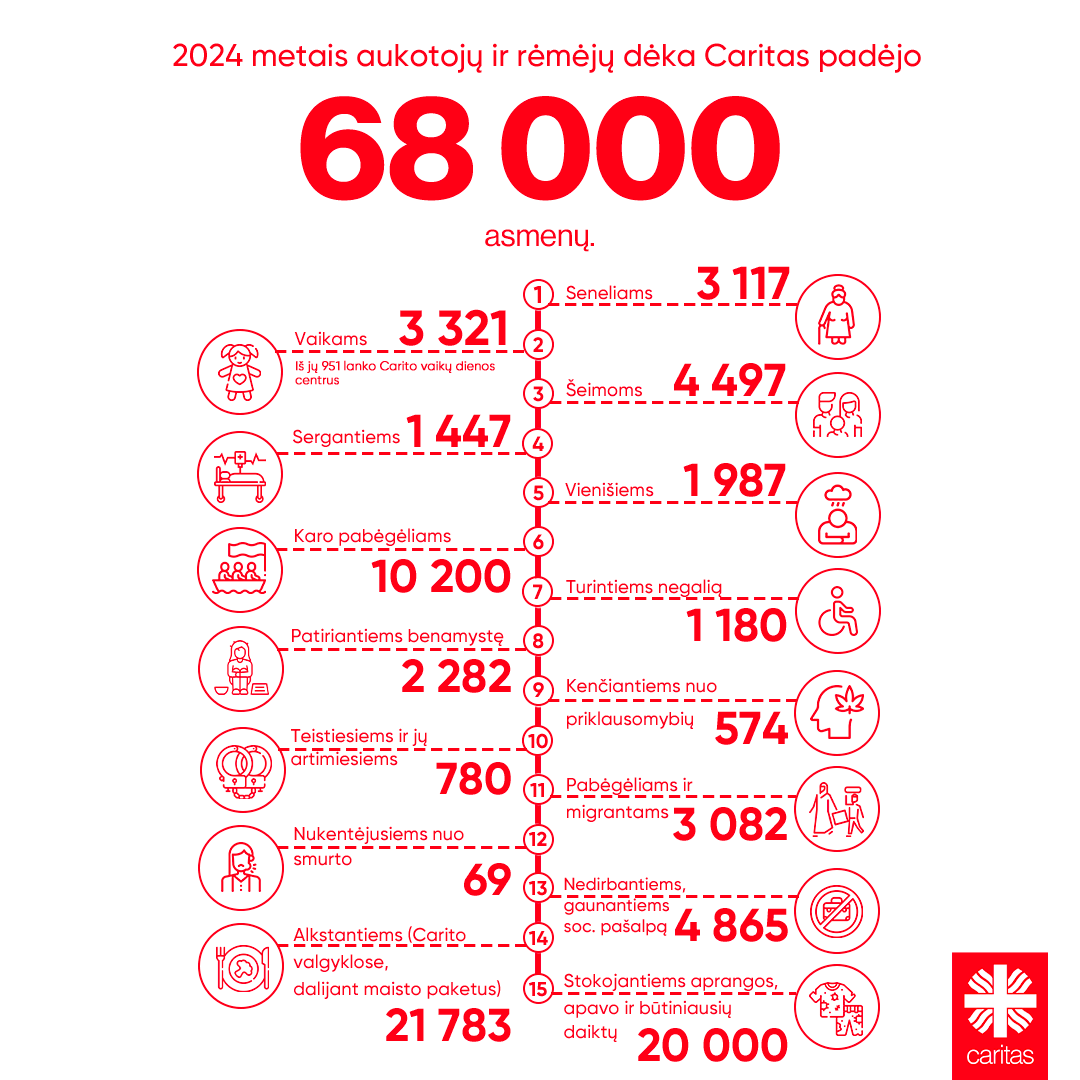 Caritas – tarptautinė katalikiška organizacija, padedanti vargstantiems, nepriklausomai nuo jų rasės, religijos, lyties ir tautybės. Beveik 3,7 tūkst. savanorių ir 395 darbuotojus telkiantis Caritas Lietuvoje sukūręs platų vaikų dienos centrų ir pagalbos šeimai tinklą, atsiliepia į sergančių, vienišų, vyresnio amžiaus žmonių poreikius, stokojančius aprūpina maistu, vaistais, drabužiais, kitais daiktais, padeda patiriantiems benamystę, smurtą, priklausomybes. Caritas jaunimas mažina technologinę vyresnių žmonių atskirtį, o migrantams, pabėgėliams, nuteistiesiems, darbo neturintiems asmenims padedama grįžti į visuomenę.