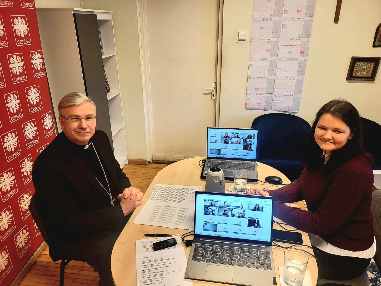 Arkivyskupas Kęstutis Kėvalas ir Lietuvos Carito vadovė Milita Čiškutė Lindžienė nuotoliniame Carito renginyje apie prekybą žmonėmis. Kaip pabrėžė nuotolinį renginį vedusi Šv. Mortos iniciatyvos prie Lietuvos Carito koordinatorė Vaida Kasulaitienė, mažinti nukentėjusiųjų stigmatizavimą ir apsaugoti pažeidžiamus asmenis nuo galimo išnaudojimo – bendras Bažnyčios, valstybės ir nevyriausybinių organizacijų tikslas. Tai, kad prekyba žmonėmis jau seniai tarptautinio masto, o kova su ja – ne vien policijos, nevyriausybinių organizacijų (NVO) ar valstybės, bet ir visos žmonijos rūpestis, ne kartą kartojo šviesios atminties popiežius Pranciškus. Būtent jis ėmėsi burti įvairių sričių profesionalus: teisininkus, policijos pareigūnus, socialinius ir humanitarinius darbuotojus, Bažnyčios atstovus, kad galėtų tarpusavyje dalintis patirtimi ir ieškoti veiksmingų sprendimų žmogaus orumui apginti.
