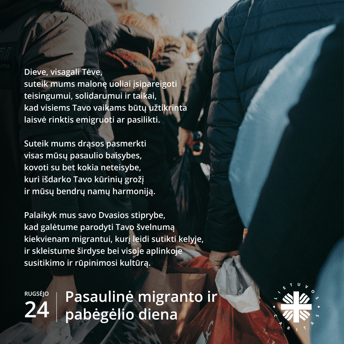 „Aš buvau išalkęs, ir jūs mane pavalgydinote, buvau ištroškęs, ir mane pagirdėte, buvau keleivis, ir mane priglaudėte, buvau nuogas – mane aprengėte, ligonis – mane aplankėte, kalinys – atėjote pas mane“ (Mt 25, 35–36). Šie žodžiai skamba kaip nuolatinis priminimas atpažinti migrantą ne tik kaip pagalbos reikalingą brolį ar seserį, bet ir kaip patį Kristų, beldžiantį į mūsų duris. Siekdami garantuoti, kad kiekvienu atveju migracija būtų laisvo apsisprendimo vaisius, esame pašaukti kuo labiau gerbti kiekvieno migranto orumą; tai reiškia, jog būtina kuo geriau lydėti ir valdyti migracijos srautus, statyti tiltus, o ne sienas, plėsti saugios ir reguliarios migracijos kanalus. „Kad ir kur nuspręstume kurti savo ateitį, gimtojoje šalyje ar kitur, svarbu, jog ten visada būtų bendruomenė, pasirengusi priimti, apsaugoti, skatinti ir integruoti visus, be skirtumų ir nepaliekant nė vieno nuošalyje“, – pabrėžia Popiežius Pranciškus.