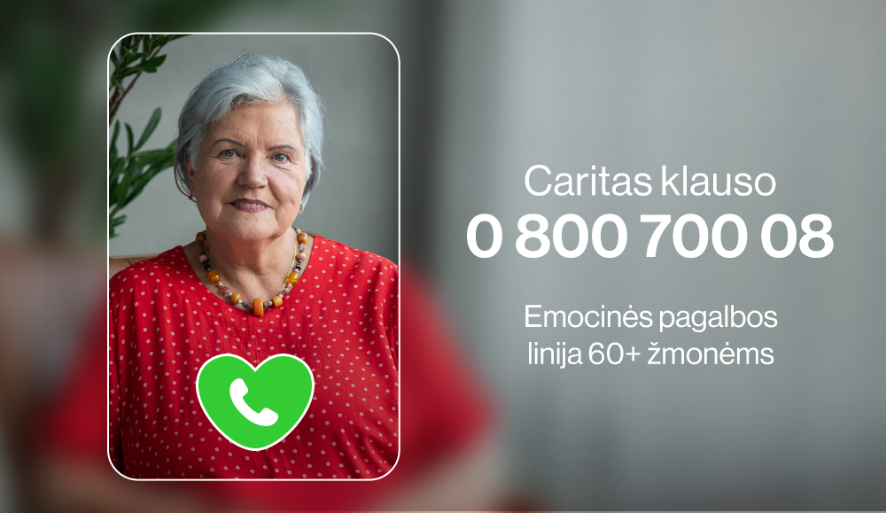 Primename, kad emocinės pagalbos linija vyresnio amžiaus žmonėms telefonu 0 800 700 08 veikia nuo liepos. Bendrauti su apmokytais savanoriais „Caritas klauso“ telefonu, nepriklausomai nuo gyvenamosios vietos, vyresnio amžiaus žmonės gali kiekvieną darbo dieną, nuo 9 iki 19 valandos.